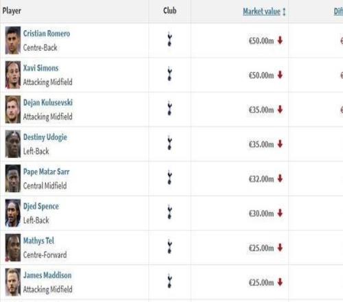 热刺17人身价变更:16人身价下跌,罗梅罗等三人跌1000万