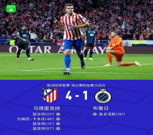 马竞总分74布鲁日晋级欧冠16强,瑟洛特戴帽,卡多佐破门