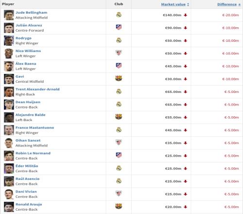 西甲身价跌幅榜:贝林厄姆跌2000万欧居首,罗德里戈、加维、小蜘蛛跌1000万欧