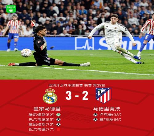 一场32激战!皇马击败马竞,维尼修斯双响炮,巴尔韦德红牌罚下