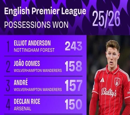 本赛季英超赢得球权排行榜:安德森断档领先,赖斯、索博上榜