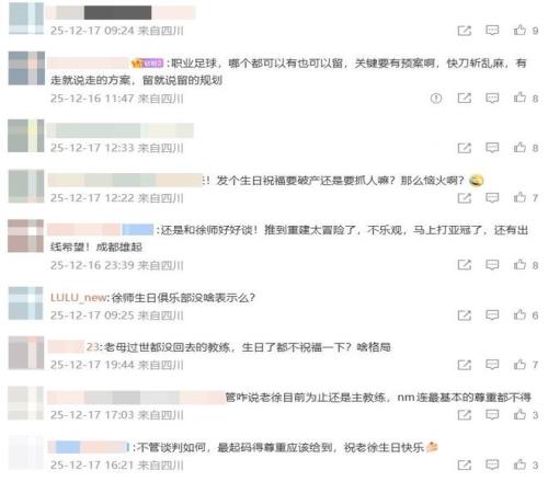 因为主帅即将离任,就连生日祝福都省了,蓉城官媒也引发了广大球迷的不满。