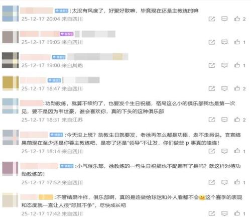 对此,不少蓉城球迷纷纷在社媒刷屏怒喷俱乐部:“真的很没有风度,好聚好散,而且现在还没有官宣离任,他就还是我们的主帅!”;“就算离任,徐正源也是功勋教练,格局这么小的俱乐部还是第一次见到!”;“难道是领导要求不让发吗?这样对待功勋教练真的令人心寒!”