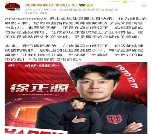 而在去年的12月17日,成都蓉城官方账号在当天上午9点多,就早早发文祝徐正源生日快乐,然而今年截止到17日晚上10点多,蓉城社媒仍静悄悄、没有发文。