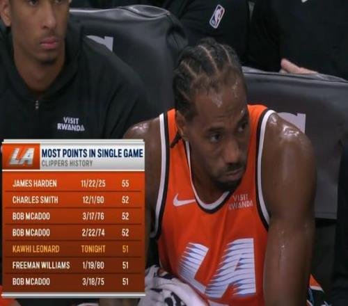 本场比赛,快船队球星伦纳德表现神勇,全场比赛他出场38分38秒,26投17中得到了生涯新高的55分,另有11篮板2助攻5抢断3盖帽入账,三分球10投5中,罚球17中16,出现了3次失误和2次犯规,正负值为+19。
