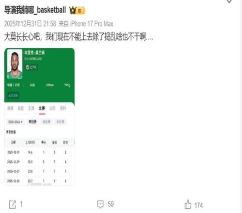 但更多的还是莫兰德个人的问题,辽宁现在也不是完全没有后卫,王岚嵚、布朗都能持球、能组织,威尔斯也能承担一部分组织任务,但这几位都和莫兰德不来电,这只能说明莫兰德确实是能力有限,也非常挑体系,遇不到好的控卫,他就功力尽失,甚至还会消极怠工。