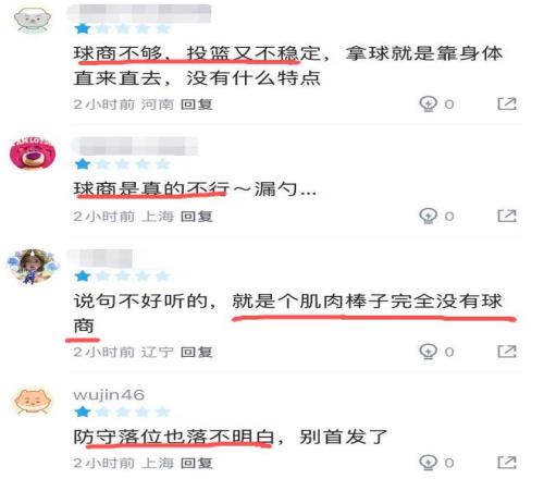 本轮上海主场95-78力克广州的比赛,刘礼嘉首发出战13分钟,3投1中,仅得到2分2篮板,正负值是全队最低的-9。要知道,这场比赛上海可是赢了对手17分,看着刘礼嘉在场上好像不知所措的样子,球迷直言:球商是真的不行……
