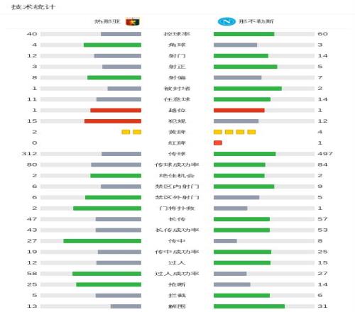 北京时间2月8日意大利足球顶级联赛 联赛 第24轮,热那亚主场对阵那不勒斯。上半场,梅雷特送点,马利诺夫斯基主罚命中。麦克托米奈射门被扑出,霍伊伦扳平比分。随后,麦克托米奈轰入世界波。下半场,布翁焦尔诺后场玩火被断,科隆博扳平比分。胡安-热苏斯犯规,被主裁出示第二张黄牌罚下。补时阶段,韦尔加拉造点,霍伊伦一蹴而就完成绝杀。全场比赛结束,十人那不勒斯3-2战胜热那亚。