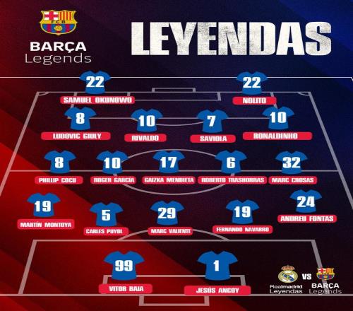 巴萨方面同样星光熠熠,普约尔、里瓦尔多等传奇悉数登场。罗纳尔迪尼奥多次完成穿裆过人和极具观赏性的个人突破,并为队友送出妙传,但始终未能转化为进球。比分变为0-2后,罗纳尔迪尼奥尝试回撤中场,联合里瓦尔多和门迭塔组织进攻,久利与诺利托则在边路利用速度制造威胁。门将卡西利亚斯两次用身体化解诺利托的射门,力保球门不失。当卡西利亚斯和罗纳尔迪尼奥被换下场时,均收获全场起立鼓掌。
