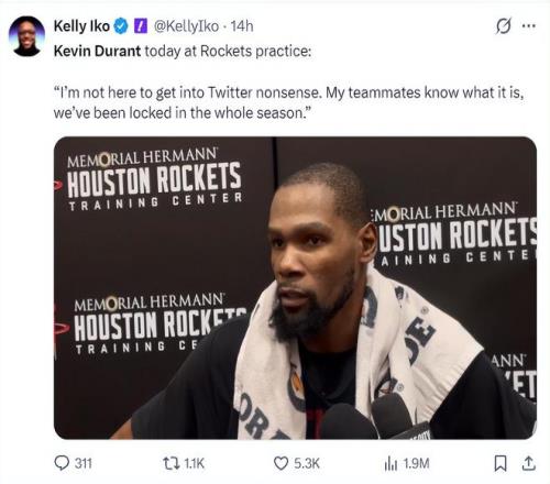 杜兰特在训练后接受采访谈到近期的疑似小号风波,他说道:我根本不想卷入推特上那些无稽之谈,我的队友们都知道怎么回事,我和火箭队整个赛季都在全力以赴。