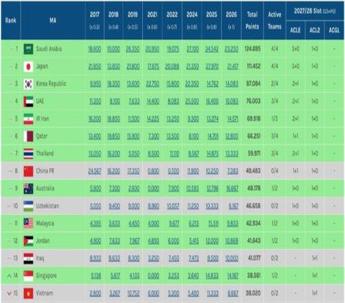 随着中超四支球队在亚冠赛场的全军覆没,中超球队本赛季的亚足联积分仅7.383分,不及去年的10.250分。