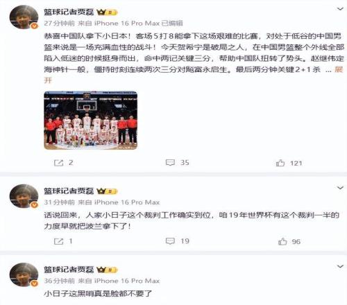 篮球记者贾磊老师更是怒斥裁判黑哨,“小日子这黑哨真是脸都不要了!话说回来,人家小日子这个裁判工作确实到位,咱19年世界杯有这个裁判一半的力度早就把波兰拿下了!”