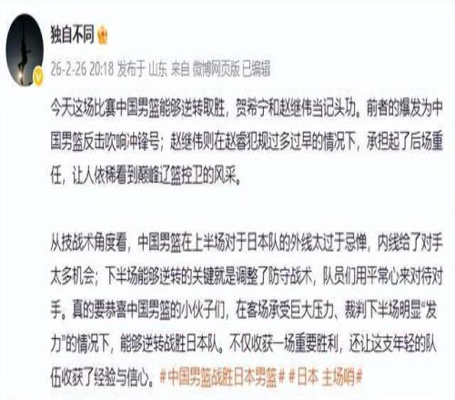 “中国男篮在日本打出了一场精彩的逆转战,从上半场最多落后15分,到下半场打出54-33,有点长沙亚锦赛逆转韩国队那味儿了。上下半场判若两队,关键在第三节首发上了廖三宁,与贺希宁一起,双宁联手打出良好进攻开端,14-0抹平分差。中国队的三分球下半场进了7个,其中贺希宁、赵继伟、高诗岩胆大手准,外线一开,由此打开了胡金秋的攻筐火力,下半场得了12分……在防守上,中国队改善了挡拆防守,不过度防对手三分,对手后两节也只进了3个三分……中国队不缺拼劲,就是进攻差,想赢怕输,防守用力过猛,犯规太多,上半场投得不好,差得甚至不敢投。下半场变换了用人,增加了“双宁”的进攻,一顺百顺……最后的3罚一掷也是没谁了……当然,困难越大越能提醒环境恶劣,祝中国队借这一场彻底打开信心,下一战轻松拿下台北。”