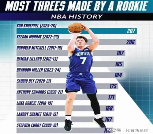 穆雷在其辉煌赛季中,凭借极高的出勤率,在80场比赛中投进206记三分,荣膺新秀三分王。然而,与穆雷相比,克努佩尔仅用59场比赛便登顶新秀历史之巅,少打了整整21场,这一成就令人瞠目结舌。