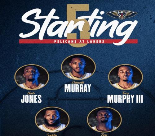 首发阵容方面,湖人队这边,雷迪克教练排出的首发五人组为:卢卡-东契奇、奥斯汀-里夫斯、马库斯-斯马特、勒布朗-詹姆斯、德安德烈-艾顿;鹈鹕这边,首发阵容则为:赫伯特-琼斯、德章泰-默里、墨菲、锡安、萨迪克-贝。
