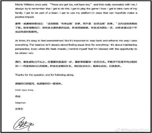 库里今天向球迷寄来了本月信:作为believer,作为球员、丈夫,库里一直在强调的是承担起自己的责任:打球不是负担,家庭不是压力,忙碌不是抱怨,而是一种被赐予的机会,生活是一种恩典: