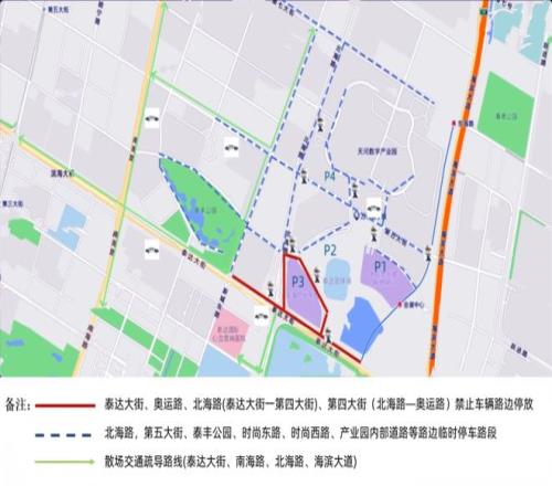 3月7日14时至散场,公安交管部门会根据实时交通流量情况实施临时交通管制:在北海路与第四大街交口和泰达大街与奥运路交口分别设置硬隔离,禁止机动车、共享单车驶入奥运路。