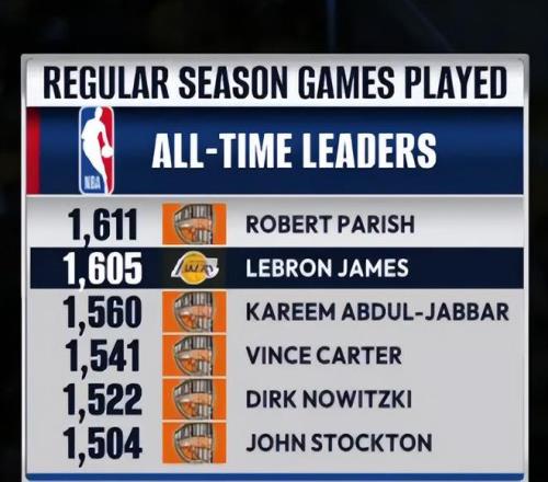 詹姆斯已经完成1605场比赛,距离帕里什1611场只差6场,詹姆斯超越帕里什只需要7场比赛,詹姆斯又要升历史第一了。