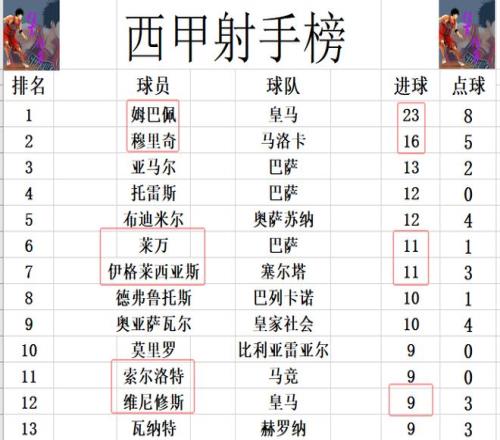 射手榜方面,姆巴佩继续缺阵,还是23球领跑,不过他的优势还是有点大,榜首位置暂时没有人能威胁到,第2的穆里奇差姆巴佩7球。伊格莱西亚斯今天打入一球后,追上莱万,11球并列第6。维尼修斯无力破门,还是和索尔洛特等人9球刚好挤入前十。