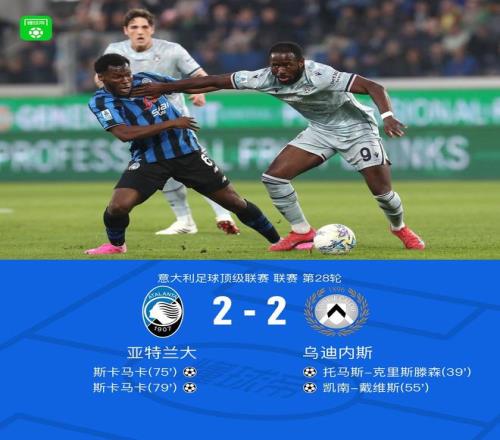 北京时间3月8日意大利足球甲级联赛第28轮,亚特兰大主场迎战乌迪内斯。上半场克里斯滕森头球首开记录,下半场戴维斯破门扩大比分,斯卡马卡5分钟内连进两球帮助亚特兰大扳平比分,最终双方2-2握手言和。