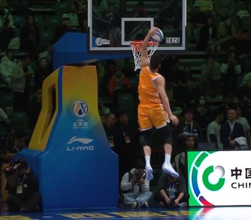 张鼎岩出场,工作人员头顶拿球,张鼎岩飞跃并夺球完成风车扣篮,获得50分。