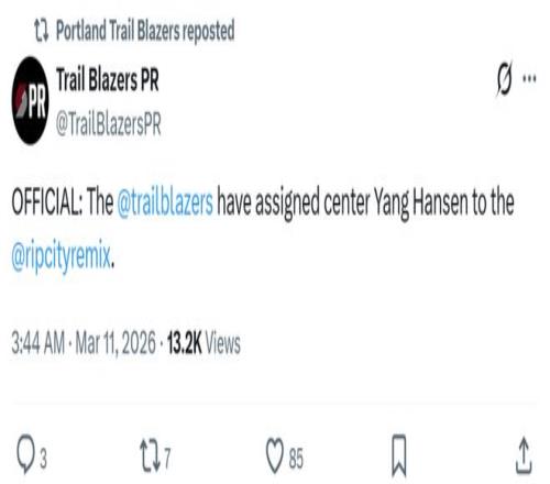 赛前开拓者官方宣布将中锋杨瀚森下放至发展联盟混音队,本赛季杨瀚森代表开拓者出战38场比赛,场均登场7.3分钟可以拿到2.2分1.5板0.6助。