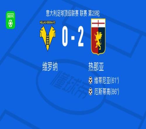 北京时间3月15日意大利足球顶级联赛第29轮,维罗纳主场迎战热那亚。比赛中,热那亚球员维蒂尼亚率先破门,随后阿龙-马丁助攻厄斯蒂高再下一城。最终,维罗纳0-2不敌热那亚。