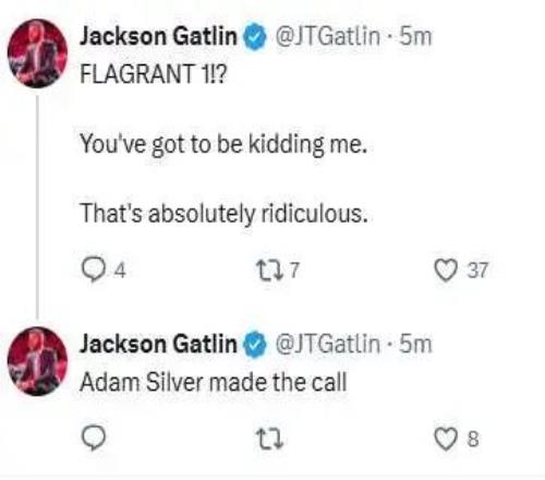 火箭队记也在社媒为大哥鸣不平: “一级恶意犯规?你在开玩笑吧?这简直太荒谬了。”