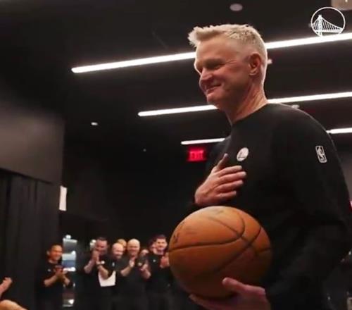 赛后,勇士全队在更衣室给科尔进行庆祝,因伤休战的库里用一次击地“助攻”,将比赛用球送给科尔进行祝贺:“在我们结束之前要先祝贺你,12个赛季为这支一直难以置信的球队做所的事(达成执教600胜里程碑)。”