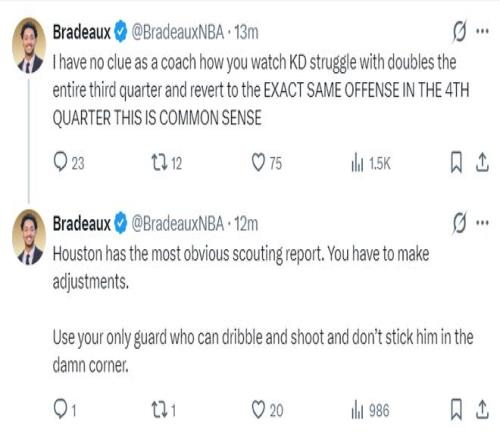 火记:休斯顿现在的情况一目了然,乌度卡就该做出调整,明明有一个可以控球的后卫,你却把他放在该死的底角。作为教练我实在是搞不懂,你让杜兰特整个下半场被高位包夹却没有任何的战术调整,这简直就是常识问题。