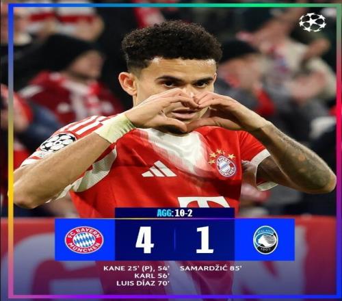 凯恩在第25分钟点球破门,拜仁取得1-0的领先。下半场比赛开场不久,凯恩梅开二度扩大了领先优势。此后卡尔和迪亚兹又先后取得进球,拜仁4球领先对手。第85分钟萨马尔季奇为亚特兰大打入挽回颜面的进球。最终两回合比赛战罢,拜仁10-2大胜亚特兰大。
