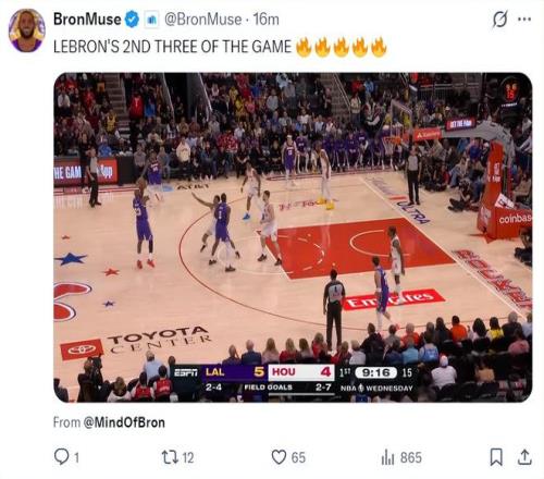 第二节勒布朗又完成了一个空中接力的暴扣,随后接拉拉维亚传球后快攻在罚球线的附近单臂劈扣,湖人拉开打13分打停火箭。湖媒:41岁的勒布朗仅打12分钟已经完成三次暴扣,看哭了GOAT。