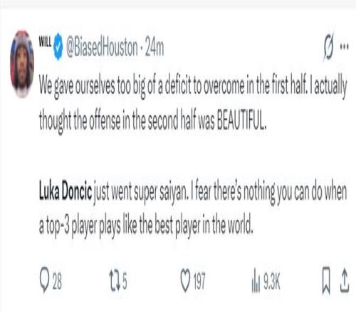 休媒都被东契奇打服:我们上半场给自己设定了追赶目标结果没能完成,但我们下半场进攻回暖。只可惜东契奇在决胜时刻达到了超级赛亚人的状态,当一名联盟前三的球员表现的跟全世界最佳一样,我们已经无能为力。