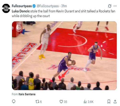 东契奇在开场制造了伊森三分犯规只可惜三罚都未能命中,随后场边有火箭球迷开始喷东契奇,这可惹怒了东皇,他抢断杜兰特后跟场边球迷对喷,随后东契奇打开了得分模式,前5中1的他后4投全中,单节9中4+三分6中3拿到13分3篮板3助攻1抢断。