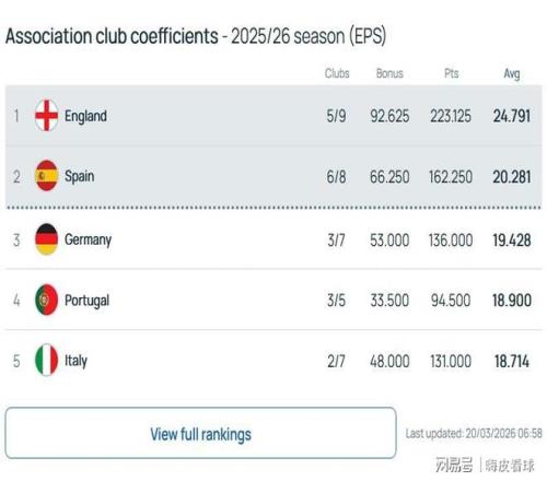 大家比较关心的欧洲联赛排名,根据欧足联公布的最新积分榜,英超在欧冠表现不佳,剩下两个杯赛还不错,领先优势从5分,只是缩小到4.5分。西甲6队在16强全部晋级,已经反超德甲,并且拉开了将近0.8分的差距。葡超3队同样在16强全部晋级,超越了意甲,上升到第四名,只能说,亚平宁足球真的没落了,意大利国家队下周参加附加赛,会不会连续三届无缘世界杯呢?