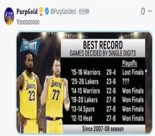 另一项数据更吓人:分差个位数的比赛,湖人23胜6负,胜率79.3%。自2007-08赛季以来,这个胜率排在历史第二,仅次于2015-16赛季的勇士。
