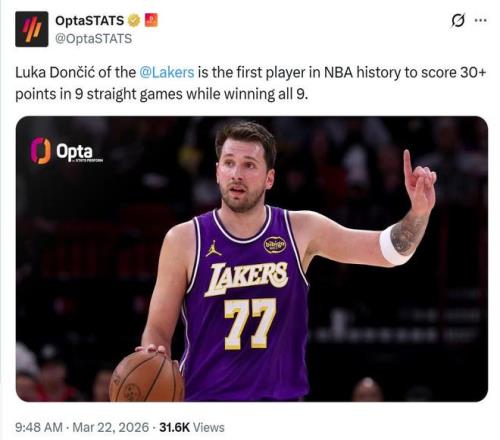 上半场东契奇早早砍下24分,这是其本赛季第38次半场拿到20+,成功升至湖人队史第四。