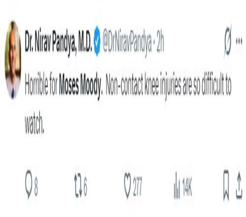 运动医学专家Nirav Pandya直言:这对穆迪来说是糟糕透顶的伤病,非接触的膝盖伤势太令人揪心了。